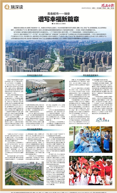 2024年,瑞安全面落实三个“一号工程”,深入实施“强城行动”,积极投身“三化四强五争”行动热潮,奋力书写瑞安幸福新篇章。上半年,瑞安实现地区生产总值626.97亿元,同比增长6%;城乡居民人均可支配收入同比分别增长4.7%和6%;规上工业总产值、增加值同比分别增长9.6%和11.8%,新质生产力示范区建设迈出坚实步伐;温州首个跨境电商“9810”出口全链路试点落地瑞安;9月,全国首个县级涉外商事调解中心在瑞安成立。
