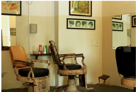 离家不远的菜场口,有间光明剃头店。那年我六岁,二姐带我去剃头。剃头店门边柱子上,装着红白蓝三色玻璃桶,没见啥时旋转过。店门外是一排路廊,淡淡阳光漏过瓦缝间隙,投射到店堂,护身布一抖,灰尘就在光影中,慢慢悠悠。泥地上坑坑洼洼,头发屑扫不净,黑白灰发相间,有些已踩进泥地。大小高矮不一的椅子,挨着墙壁,呈“匚”字儿排开。玻璃镜上了年头,模糊斑驳,悬挂在墙壁上,规格尺寸不甚相同,水银已渗出来,斑斑点点,形状各异,但依稀还能透过缝隙,看出护身布上方的模糊人像。
