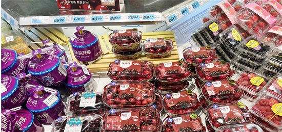 在瑞安某超市的保鲜柜里,记者也发现了车厘子的身影,数量不多,但格外醒目。按照大小和品质区分,4J果实250克的售价99元,3J果实250克的售价69.9元,2J果实250克的售价49.9元。