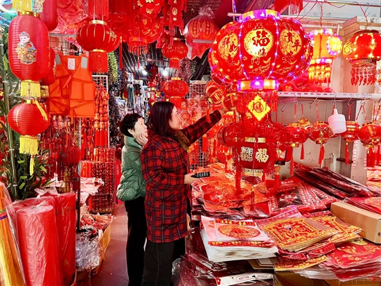 本报讯(记者 项依晴 王晓阳 实习生 朱思妍)春节脚步渐近,新春饰品迎来销售旺季。连日来,在瑞安商城内,三三两两的市民穿梭其中,精心挑选各类春节挂饰,现场热闹非凡,浓厚的节日氛围扑面而来。店铺里,春联内容丰富多彩,既有传统的吉祥话,也有结合时代特色的创新词句,满足了市民的不同需求;各种寓意吉祥的挂饰和年画也备受青睐,成为市民选购的热门商品。