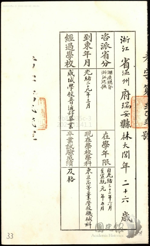 上述文献,作为清末浙江留日学生的重要舆论阵地,有关数据为名册提供早期基础信息,例如官费生王鸿年(使馆官费)、游寿宸、陈蔚(南洋官费)等;以及自费生黄曾锴、林大闾等瑞安望族子弟等;早期留学生多集中于弘文学院(语言培训)、成城学校(军事预备)等。而且,上述文献统计也反映出晚清温州留日学生的结构性特征,比如,71%的学生为自费,凸显地方望族对教育革新的推动;师范、法政、军事等实用学科占主导,与“教育救国”理念一致。