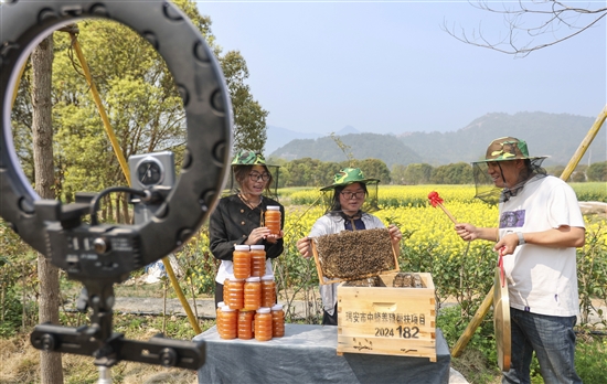 本报讯(记者 夏盈瑜 贾洁楠 陈峥)“大家好,这里是瑞安市湖源村蜂蜜‘采蜜权’拍卖现场……”昨日上午,地处我市西部山区的湖岭镇湖源村养蜂基地迎来“名场面”——在竞相盛开的油菜花、桃花花田里,该镇宣传干事陈亦琳和村干部娄明文、王爱燕架起直播设备,开启田园竞拍。据悉,这是我市首次面向全国拍卖“采蜜权”。