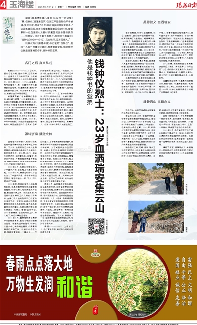 翻阅《钱基博年谱》,看到1942年一则记载:“夏,侄钟仪(钱基厚四子)在浙江平阳县孙山不幸被捕,坚贞不屈,同年7月13日在瑞安被国民党枪杀。”这让笔者记起,前年在搜集整理集云山史料时,曾留意到一位在集云山龙星村惨遭国民党杀害的英烈——钱钟仪。当时下载了其照片,在照片下面备注:“钱钟仪(1920—1942),又名钱行,江苏无锡人。”