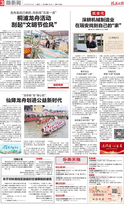 本报讯(记者 项颖 蔡伟 实习生 蒋依芮)端午临近,连日来,龙舟活动的鼓声在仙降街道的各条河道上渐渐响起。与往年不同,今年仙降街道各村龙舟队以创新实践推动移风易俗,摒弃燃放烟花爆竹、举办豪华宴席等传统习俗,把节省的龙舟活动经费转化为民生公益投入,让传统民俗与文明新风深度融合,奏响基层治理与乡风文明建设的和谐乐章。