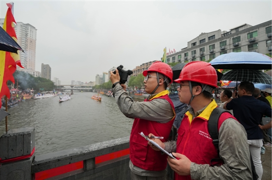 5月25日上午,在塘河南路附近的河道旁,电力工作人员重点检查了沿河配电线路、变压器及临时用电设施,并利用无人机巡检技术对电力设备进行全方位监测,确保无外力破坏风险。同时,工作人员向龙舟队负责人及围观群众发放《安全用电手册》,讲解电力设施保护知识,提醒龙舟队伍划桨时与电力线路保持安全距离,避免发生触电事故。“我们重点对龙舟停靠码头、民俗表演区等区域的用电设备进行排查,确保线路绝缘良好、配电箱安全可靠。”玉海供电所工作人员程品嘉说。