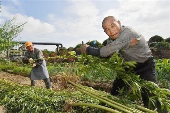 采收方式有两种,即砍麻与拔麻。砍麻,右手握砍刀,左手拢住两三根麻杆,一刀砍断;拔麻则是双手拢住两三根络麻,先往前一送,然后使劲往后一拽,连根拔起。