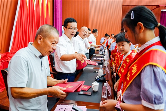 在今年8月18日仙降街道举行的2025年度教育大会上,浙江鸿一箱包皮件有限公司董事长许道溪为43名学子送上定制行李箱,这一“送家乡特产”环节已成为该街道教育大会的固定项目。