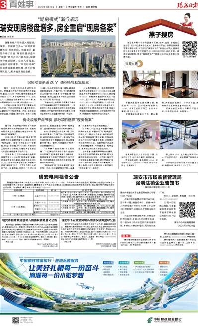 该负责人介绍,商品房销售本身就明确规定包括“预售许可”与“现房备案”两种方式。“早在十几年前,瑞安就有项目采用‘现房备案’模式销售,只是后来房地产市场处于高速发展期,这种模式才逐渐被市场淡忘。当前房地产行业进入新的调整周期,开发商选择‘现房备案’是其顺应市场变化的自主行为。”