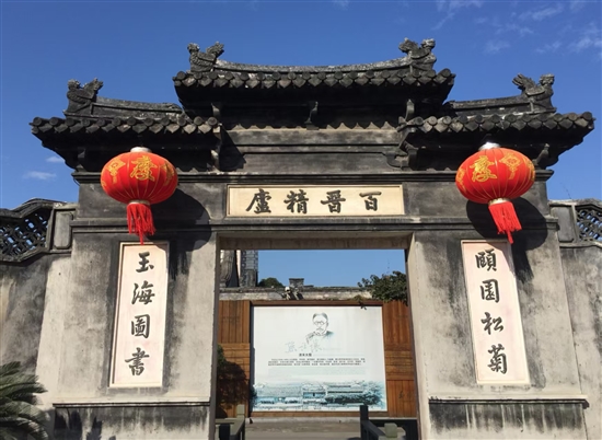 从南门进玉海楼时,首先映入眼帘的是建筑考究的门台正上方“百晋精庐”四个大字,大家也许会有疑惑,不是玉海楼吗,怎么是百晋精庐?其实,我们平时所讲的玉海楼,是玉海藏书楼、孙诒让故居、百晋陶斋、颐园、后花园等总称。玉海楼总体布局,南北坐向,为三条纵轴线。百晋精庐,也就是百晋陶斋,坐落在中间线上,玉海藏书楼西侧、故居东侧,前面有“颐园”。它原名“恰受航”,俗名“船厅”,由孙诒让父亲孙衣言取杜甫“野航恰受两三人”诗意命名,后为孙诒让收藏古砖之所,故改名“百晋陶斋”。