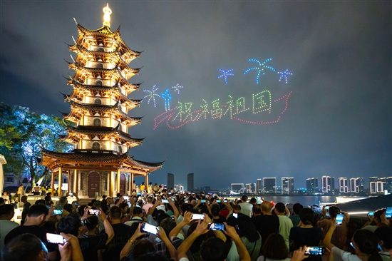 每一幅画面的切换都精准流畅,引得现场观众阵阵惊呼与赞叹。许多游客早早便聚集在最佳观赏点,举起手机记录下这难忘的时刻。带着家人前来观看的市民缪剑侠表示:“太震撼了!古今交融,创意十足,这个节日过得非常有意义。”