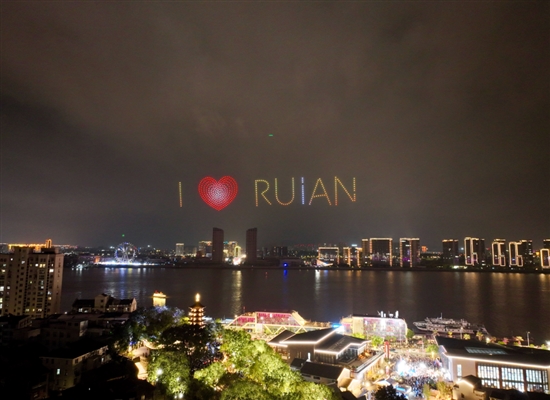 随着表演正式开始,500架无人机同时腾空而起,如流萤般飞向预定位置。它们时而组合成当地标志性的国旗教育馆、玉海楼等建筑轮廓,将深厚的历史文化底蕴在夜空中完美复刻;时而又化作绽放的繁花与“国庆快乐”“祝福祖国”“天瑞地安”等标语,营造出热烈祥和的节日氛围。
