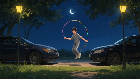 夜晚,一轮新月缓缓升起,我独自拿着跳绳来到楼下,一股清新的空气迎面扑来。我在楼下左顾右盼,走来走去,寻找着一个行人较少的安静角落。转了一会儿,我来到了两辆车之间的大空隙,仔细确认这里不会被干扰后,就开始了今天的跳绳运动。