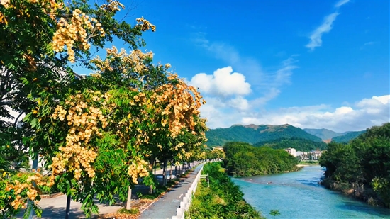 瑞安的秋天,从栾树开花开始。近日,在湖岭镇湖源村滩林路,一棵棵栾树悄然撑起了一路的温柔——枝叶间一半是夏日的翠绿,一半已染上秋天的金黄,吸引了不少市民和游客驻足拍照打卡。