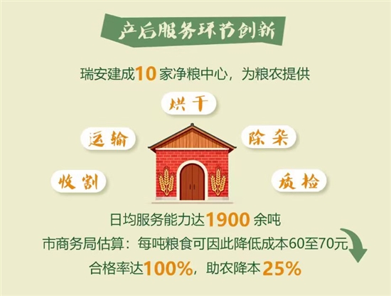 产后服务环节的创新,则为保障粮食品质和农民收益加上了另一道“安全锁”。近年来,瑞安市推进“净粮工程”,建成10家净粮中心,为粮农提供收割、运输、烘干、除杂、质检等“一站式”产后服务,日均服务能力达1900余吨。据市商务局估算,每吨粮食可因此降低成本60至70元,合格率达100%,助农降本25%。
