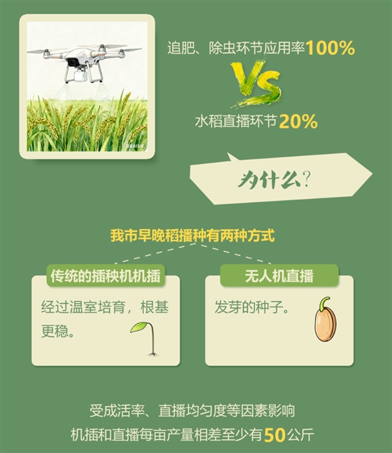 原来,我市早晚稻播种有两种方式:传统的插秧机机插和无人机直播。机插秧苗经过温室培育,根基更稳,而无人机直播的是发芽的种子。据农户经验估计,受成活率、直播均匀度等因素影响,机插和直播每亩产量相差至少50公斤。