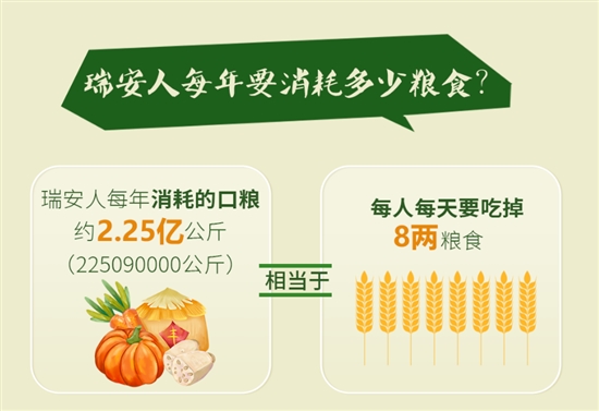 那么瑞安人每年要消耗多少粮食?按照全省粮食产销统计和计算(2023年),瑞安人每年消耗的口粮约2.25亿公斤(225090000公斤),换算下来,人均年消耗147.12公斤,相当于每人每天要吃掉8两粮食。这些数字背后,是地方政府为确保区域粮食安全所构建的一套严密体系。
