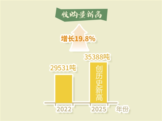 为防止“谷贱伤农”,并持续激发农户种粮积极性,政府实施的粮食收购政策发挥了关键作用。近年来,我市政府粮食收购呈现“量价齐升”的良好态势。据市商务局数据显示,2025年早稻收购量35388吨(较2022年增长19.8%);价格方面,今年收购价为132元/50公斤(较去年上涨1元),加上订单奖励,农户实际收益可达162元/50公斤,创近年新高,农户们交售“订单粮”热情持续上升。