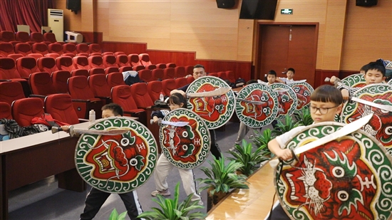 本报讯(记者 戴娜 见习记者 陈小斌)10月27日下午,塘下镇新华小学排练厅内,一群小学生正精神抖擞地演练着国家级非物质文化遗产——瑞安藤牌舞。他们手持特制藤牌与大刀,身姿矫健,或站立、或半蹲,以藤牌遮身,时而辗转腾挪,时而挥刀进攻,在一招一式中传承着百年民间智慧。