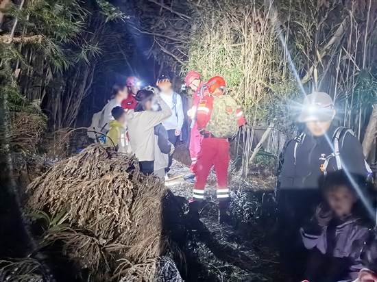 在翻越了几道峡谷后,救援人员终于找到了被困的11名群众。队员们顾不上休息,立即进行分工。他们将队伍中的儿童和女性编成几组,由经验丰富的队员引领下山。经过数个小时的紧张救援,终于在3日凌晨1点多,被困的11名群众全部被带出峡谷。