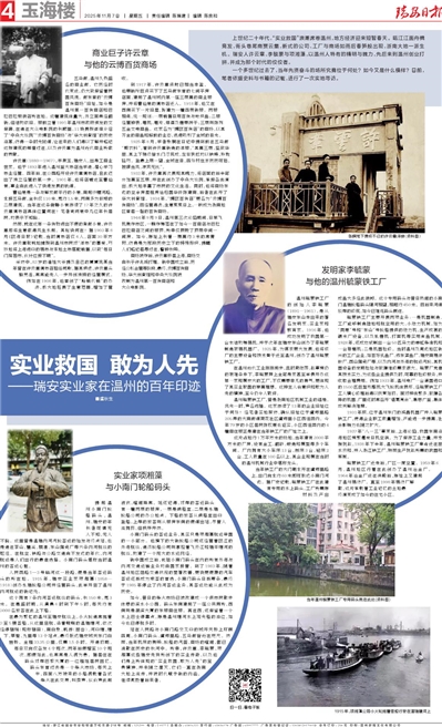 站在人民路与小南门路交叉口的城开天桥上环顾四周,小南门码头、虞师里路、五马街皆近在咫尺。然而,当年机床的轰鸣、轮船的汽笛、商场的喧闹,都已消散在历史的长河中。所幸,许云章、李毓蒙、项湘藻这些瑞安先贤所创下的实业传奇,以及他们身上所体现的“实业救国、敢为人先”的宝贵精神,并未随之湮灭,它们一直在浙南大地上流传,并被时代赋予新的内涵,继续激励着后来者。