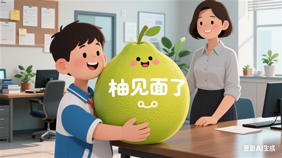 我刚放下包,一个背着书包的男孩从门口走进来,塞给我一个黑色塑料袋:“老师,给您的!”我好奇地打开,竟是个青黄饱满的大柚子。他眨着眼睛说,这叫“柚”见面了。我不禁莞尔——这孩子,竟藏着这样一份清甜可爱的机灵,寻常的相见,被他酿成一句带着果香的诗。