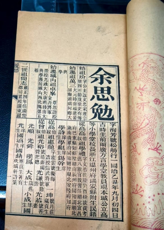 令人惋惜的是,“九间”老宅在20多年前已被悉数拆除,如今余氏宗祠的前院与道路,正是昔日余思勉祖居的遗址。而族谱中一段小小的“断档”,更添几分对历史的唏嘘。由于古时交通不便、信息阻隔,族谱在迁瑞第六代后便全然没了余思勉父亲余瀛彬及后人的记载,城里余氏后裔亦多次寻访一无所获,幸得这份贡卷,才有了将这段家族史重新续接的希望。