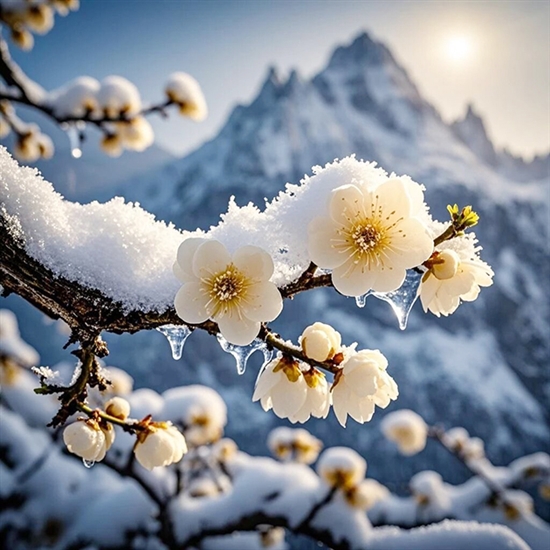 那几天降温,风裹着“雪粒子”打在脸上,像小石子儿砸得生疼。我缩在屋里烤火时,总看见那株梅花在风雪里摇晃——雪落在花瓣上,积了薄薄一层,把嫣红压成了淡粉,可它的枝桠始终没弯,花瓣也没掉一片。一天清晨,我发现它最顶端的花苞被冻得发蔫,花瓣边缘卷了起来,像皱巴巴的纸。我蹲在旁边叹气:“这么冷,你肯定开不了了。”可到了傍晚,太阳漏出一点光,那花苞竟慢慢舒展开,露出里面嫩红的花蕊,连卷边的花瓣也挺了起来,像是刚打了场胜仗,骄傲地朝着天空。