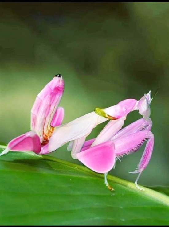 咦?这朵“兰花”怎么在慢慢向前移动呢?我很好奇,凑近仔细一看,哇!原来是一只兰花螳螂!它正摇摆着身体,慢慢地向前爬着。粉色的身体和枝叶融为一体。不认真看,真的以为是风吹过来的一朵兰花呢。