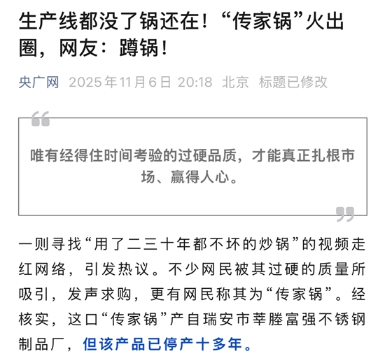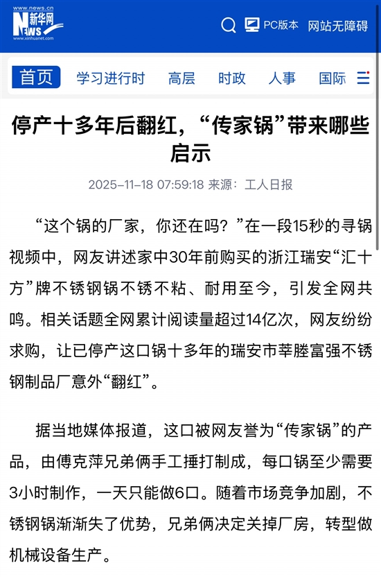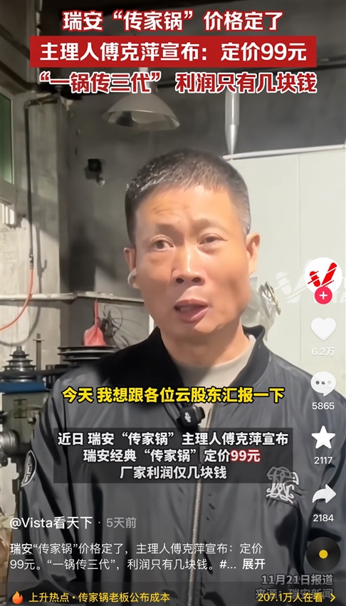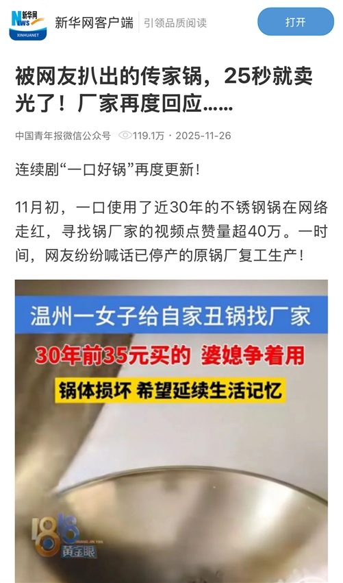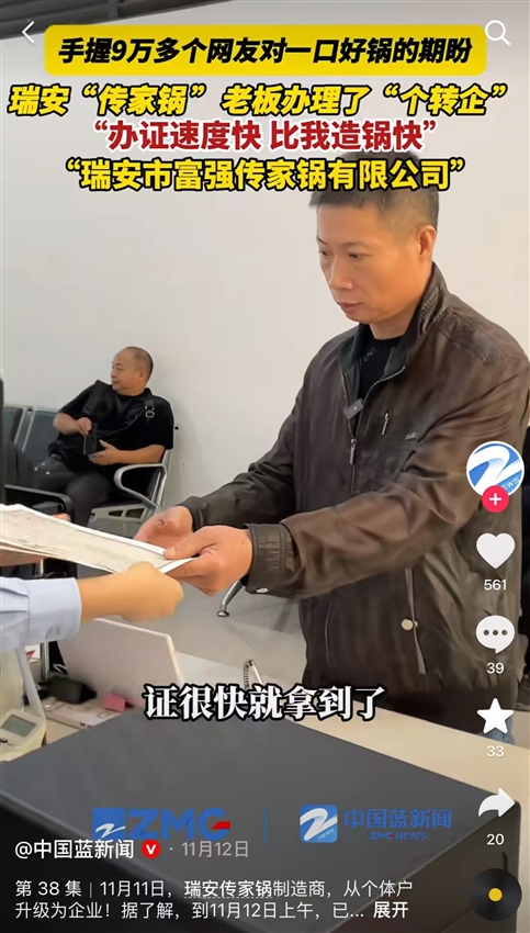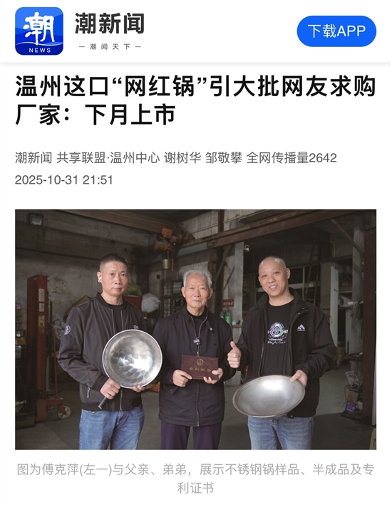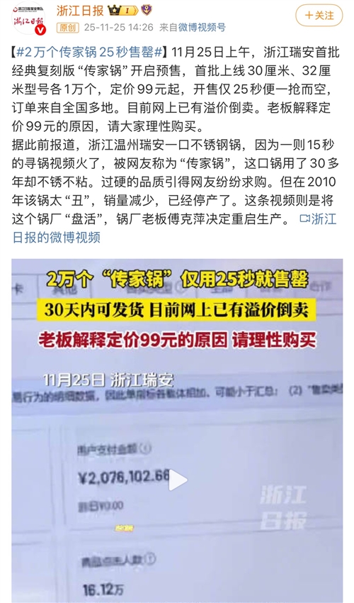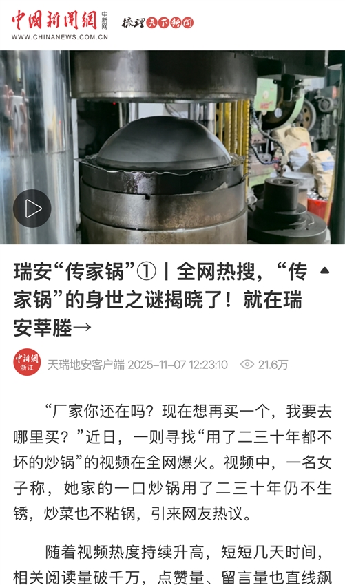截至11月26日,全网关于瑞安“传家锅”的各类作品共36万多个,全网总传播量80亿次+,相关话题登上微博全国热搜5个、社会榜热搜6个,抖音全国热榜11个(2个位居榜首)。瑞安“传家锅”外宣稿件被温州市级以上媒体录用582条次,其中国家级媒体20条次、省级媒体471条次,央广网、中新网、浙江日报等200余家主流媒体持续聚焦,成为继“鸡排哥”后2025年全国第二个现象级正能量热点。
