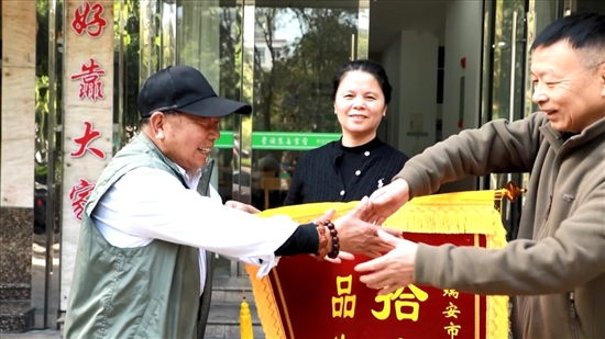 日前,赵老伯带着锦旗,专程从乐清来到瑞安,将一面写有“拾金不昧 品德高尚”的锦旗递到我市两位热心市民陈秀钗、邱冬者的手中,并向他们表示感谢。