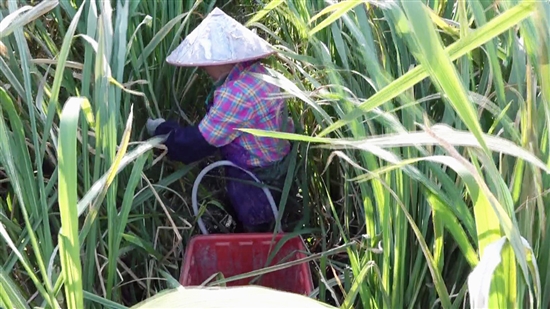 日前,在会吉村的茭白基地,村民们身着防水服,手持镰刀,穿梭在田间地头,收割着成熟的茭白。一根根洁白、饱满的茭白被整齐码放在筐中。这些茭白会被集中运到分拣点,经过冲洗、分拣、筛选、打包后,发往温州地区的各个市场。