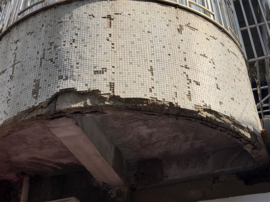 该小区位于拱瑞山路一侧,一至三层为沿街商铺,三层以上是住宅。记者看到,二、三层的外立面已破损严重,其中三层边沿处有一段长约60厘米的“掀皮”缺口,破损处随时有重物坠落的可能,内部钢筋水泥也暴露在外,而其正下方是一家餐饮店与人行道。“这处隐患存在快两年了,裂缝越来越多,风一大就可能大面积脱落。”市民监督员、该小区业主朱文忠指着破损处直言,“钢筋都露出来了,必须尽快处理!”另一名监督员胡瑞慧说:“这处墙皮已经松松垮垮,一半悬在空中抖着,万一台风来了,后果不堪设想。”