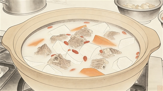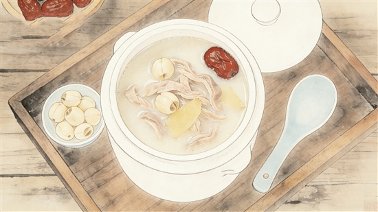 莲肚益脾羹:猪肚焯水切丝,与莲子、红枣、姜同炖 1小 时,汤色奶白调味,健脾补虚。