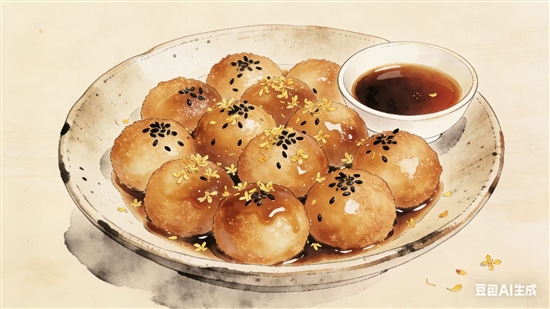 油汤圆:无馅汤圆经油煎,加老酒、红糖翻炒,挂满甜香与酒香,撒黑芝麻、桂花,外裹焦糖色脆壳,需趁热食用。