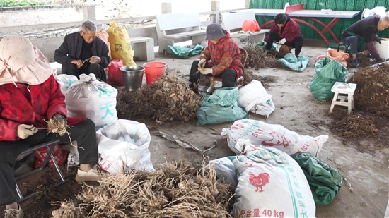 近日,在马屿镇源田家庭农场的增产增效示范片里,农场负责人项贤治正带着100多名工人,对200多亩温郁金农田进行集中采收。大家分工明确,有的挥动锄头,小心翼翼地将姜黄从泥土中刨出;有的利用工具熟练地去除姜黄上的泥土,并进行修剪、分拣、装袋和搬运。田间地头处处是一派热火朝天的劳动场景。
