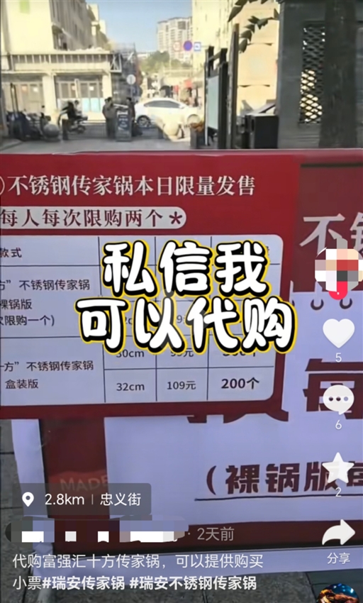 2025年12月29日,瑞安“汇十方”牌传家锅第二波预售在抖音、微信小店同步开启,2万口锅一上线即被“秒空”。线下销售同样火爆,位于忠义街历史文化街区的瑞安·传家名品馆开售传家锅,引发市民排队抢购热潮。受厂家产能限制,线下门店每日限量销售,尽管如此,仍阻挡不了市民的热情,十余日来每天排队队伍从店门口延伸至街角,甚至有游客驱车千里而来,只为这一口锅。然而,传家锅的火爆也让一些人动起了“歪脑筋”。
