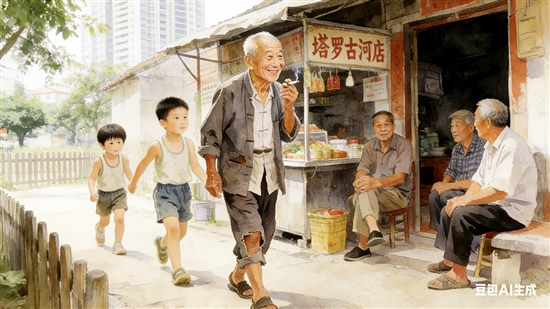 我们撒着欢儿,跑到南陈桥头小摊前,买酱菜头、菜头条儿、炒米糖、爆米花、粽糖儿、双炊糕,那几分钱带来几分钟的愉悦,自舌尖到心头。阿公微笑着,脚一踮一踮,跟在我们后面,瘸到小摊门口,和邻居们聊天,实在无话可说了,才回到厂后的家。