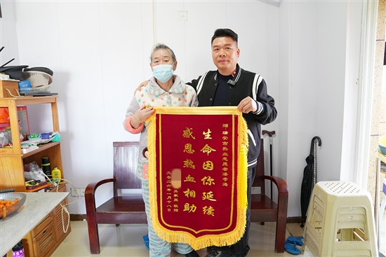 1月19日,72岁的受助者高阿姨如愿见到了她的“救命恩人”潘孝海。她将一面写着“生命因你延续 感恩热血相助”的锦旗递到潘孝海手中,感激之情溢于言表。