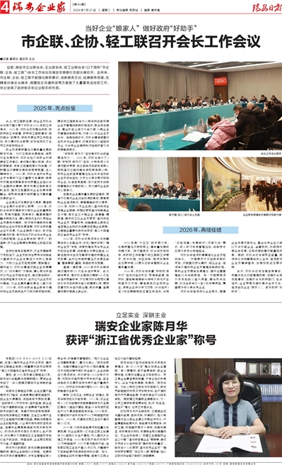 2025年,该协会还持续深化与市融媒体中心战略合作,依托《瑞安日报》“瑞安企业家”专版,深度挖掘优秀会员企业家的创业故事、创新理念与责任担当,以鲜活案例与生动笔触讲好瑞安民营企业家故事,全方位传递民营经济发展正能量,营造尊商、重商、亲商的良好氛围。