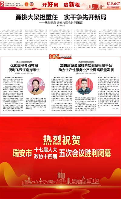2026年瑞安市两会,是在“十四五”圆满收官、“十五五”开局起步的关键节点召开的重要会议。会议期间,全体代表、委员以高度的政治责任感和饱满的履职热情,谋发展之计、建睿智之言、献务实之策,审议通过了政府工作报告、“十五五”规划纲要等一系列重要文件,依法完成了选举等各项任务。大会取得了丰硕成果,将市委的战略擘画转化为全市人民的共同意志和行动纲领,生动践行了全过程人民民主,必将进一步激发全市上下干事创业的澎湃激情,为瑞安在“十五五”新征程上勇毅前行注入强大动力。