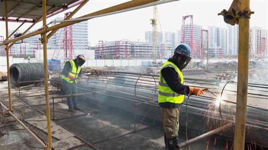 2月25日上午,瑞安市汀田中单元01—30和01—33地块建设项目施工现场一派热火朝天的景象:70余台桩机整齐列阵、轰鸣作业,焊接工位火花四溅,挖机、运输车往来穿梭,各类机械声交织成新春复工“奋进曲”。来自江西上饶的桩机工人戴玮,正月初八正式上岗。“企业福利好,报销路费、发放返岗红包,是良心企业,我们早点回来,早点复工多挣钱。”他说。