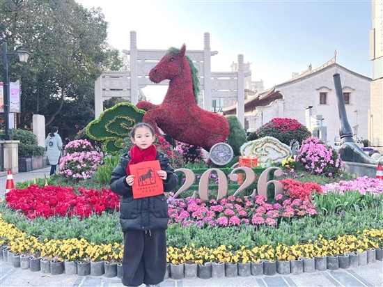 我们一家人刚拐进街口,眼前便豁然一亮。在五彩斑斓的花海中,一尊威风凛凛的“赤马”赫然矗立。它昂首挺胸,鬃毛飞扬,眼弯成弓状,仿佛下一秒就要四蹄腾空,飞奔而去。我赶紧拉着妈妈,在这匹象征着马年吉祥的赤马前,拍下了第一张合影。