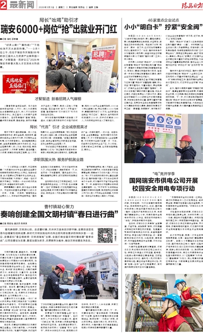 “春节假期结束后,是人才回流、企业用工旺季的关键节点,为抢抓新春求职招聘黄金期,特意举办了这场大型人才交流会。”市人才交流和市场服务中心副主任薛蕊介绍,瑞安新春大型人才交流会已连续举办十余年,成为瑞安引才留才的金字招牌。下一步,新春专场系列招聘会将走进各镇街基层一线,“引才专列”也将驶向全国高校开展专场招聘,持续把岗位送到群众家门口、把人才引到企业车间里,为我市新一年的经济发展注入强劲人才动能。