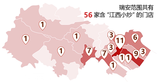 百度地图显示,瑞安主城区是江西小炒分布最密集的区域,安阳街道有11家,莘塍街道有9家。