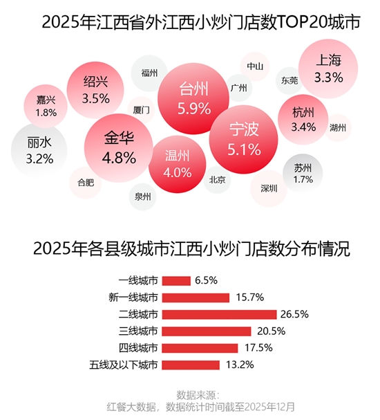 红餐网《江西小炒发展报告2025》披露,全国超八成的江西小炒门店集中在华东地区。除江西省外,浙江省的门店数量遥遥领先。
