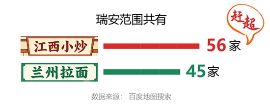 市市场监管局登记注册分局的工作人员坦言,由于市场主体的注册名要有唯一性,看起来每家江西小炒门头招牌都一样,但他们的注册名则可能与招牌毫无关系。因此想从后台精确统计江西小炒的数量是个难题。但通过第三方地图搜索,数据给出了最直白的答案:在百度地图上搜索“江西小炒”,结果显示瑞安范围内共有56家门店,而同期“兰州拉面”的数量为45家。这意味着,在瑞安的快餐版图上,江西小炒已悄然完成了对“国民快餐”兰州拉面的“超车”。