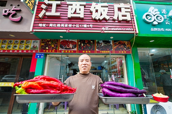在安阳街道周江路周家桥小区旁,一家江西小炒店的后厨已飘出阵阵香气,来自江西上饶的老板郑光辉正在备菜,案板上的青椒、腊肉、茄子等摆放整齐,都是为晚餐的客流提前备好的食材。