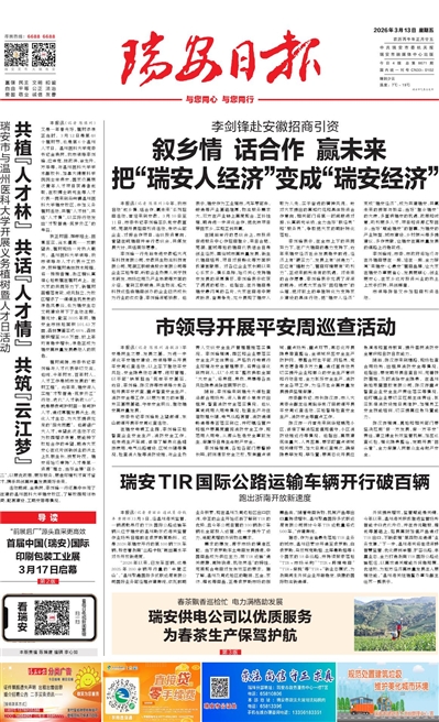 本报讯(记者 陈豫州 潘敏洁)平安是民生之要、发展之基。为进一步深化平安瑞安建设,市领导带头开展平安周巡查活动,以上率下推动平安风险、安全隐患动态清零、闭环管理,以干部“铁军担当”筑牢平安基石。近日,李剑锋、陈汉存等市领导分赴各地开展平安夜查,重点督查安全生产、消防安全等工作,以更为有力的举措,夯实基层基础,守牢安全底线,推动瑞安高质量发展。