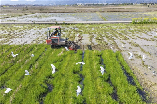 眼下正值春耕备耕关键时节,马屿镇农民抢抓农时,有序开展春耕、春种、春管等农业生产作业,机械助力生产,田间地头一片生机勃勃。图中,农户在犁地耕作,白鹭翩飞相伴。