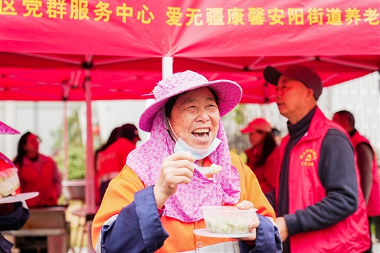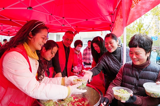 3月19日,安阳街道祥和社区在党群服务中心前举行爱心芥菜饭活动。志愿者们早早备下糯米、猪肉、芥菜等食材,精心烹制芥菜饭。他们不仅分发给普通居民,还特意将这份春日温暖送到困难群众、环卫工人、外卖小哥手中。(记者 孙凛)
